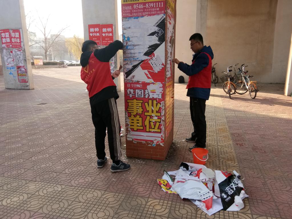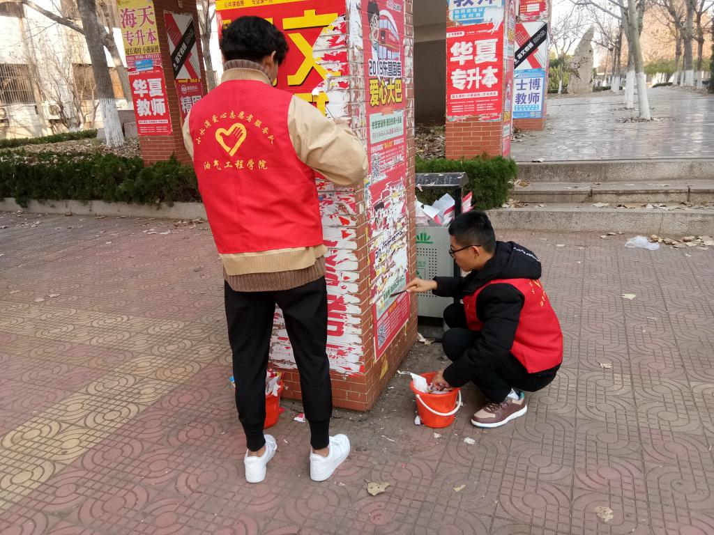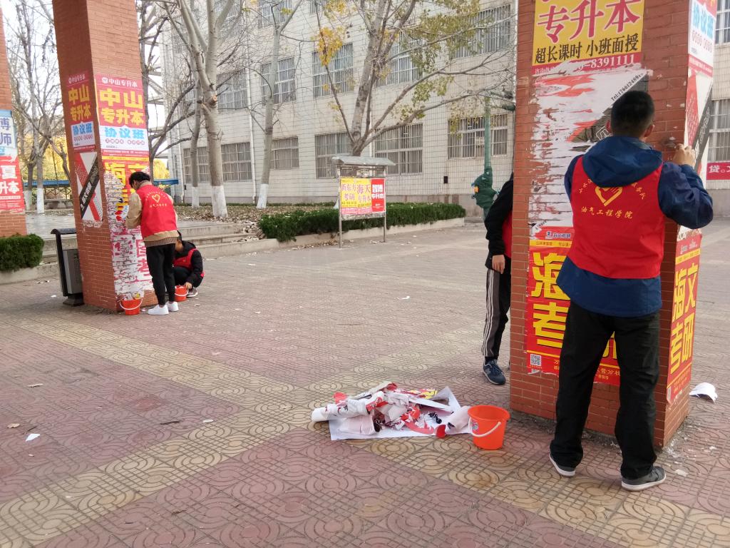 教学楼作为教学活动的主要阵地,应保持良好的学习环境,但各种随处张贴的小广告严重影响了教学楼的美观。为进一步提升学校的整体环境和形象,营造良好的学习、工作及生活氛围。2018年11月25日油气工程学院小水滴爱心志愿者服务队进行了清除校园“牛皮癣”的活动。