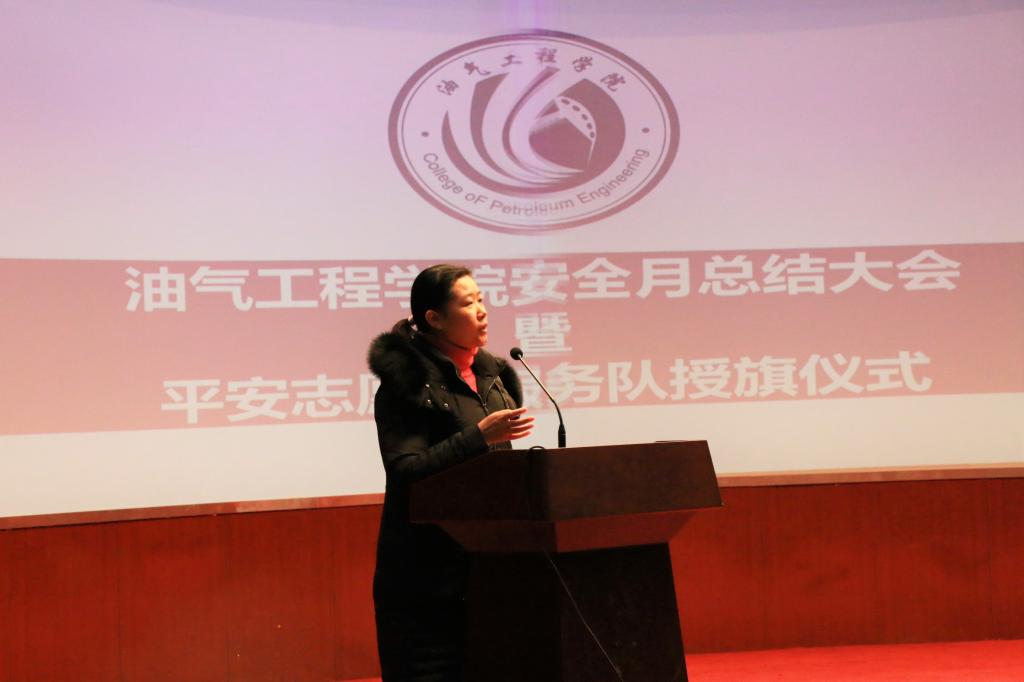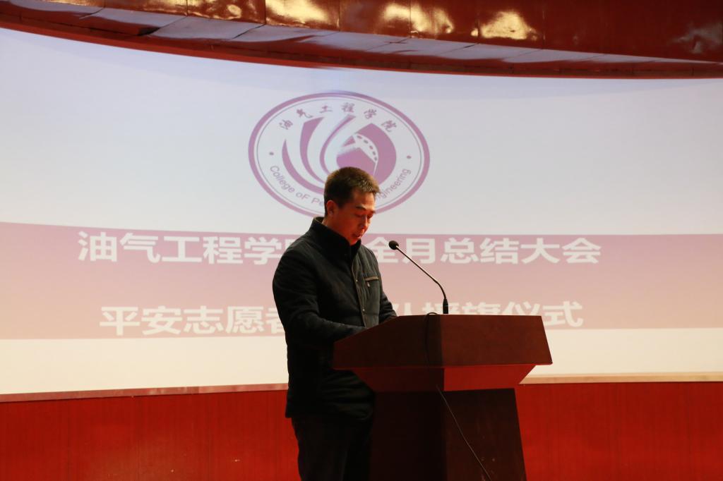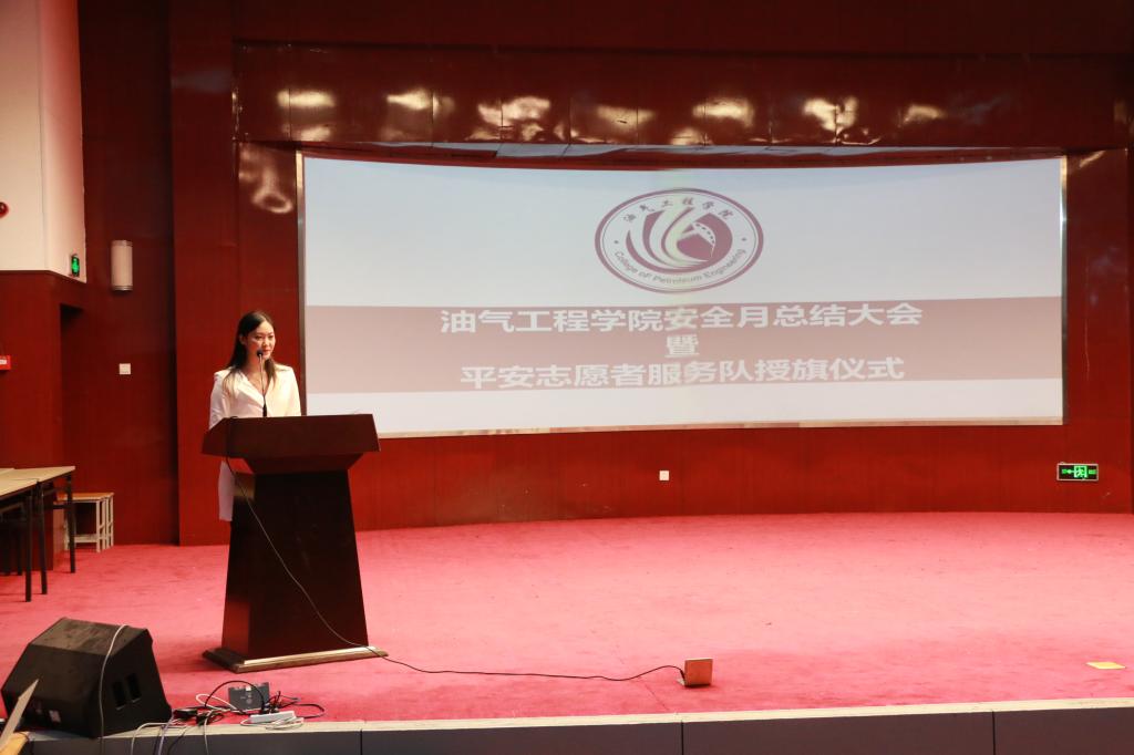 12月14日下午4点,油气工程学院于石大校区音乐厅举行安全月总结大会暨平安志愿者服务队授旗仪式。中国石油大学胜利学院副院长王晓勇,教育与艺术学院党总支书记张超,油气工程学院党总支书记章志军,滨东分局滨东派出所所长滕磊,油气工程学院学工办主任毕菲菲、团总支书记胡洪翠、辅导员老师伍佳慧、张樱巾出席了本次活动。本次活动由伍佳慧老师主持。