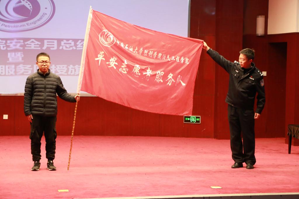 会议第四项,由滨东分局滨东派出所所长滕磊为油气工程学院平安志愿者服务队授旗,由平安志愿者服务队队长王湘涛同学接旗。接下来,由王湘涛同学作为平安志愿者服务队代表发言,王湘涛同学代表平安志愿者服务队向全体同学承诺:服务同学、乐于奉献,起好模范带头作用,为守护校园平安做出一份贡献。