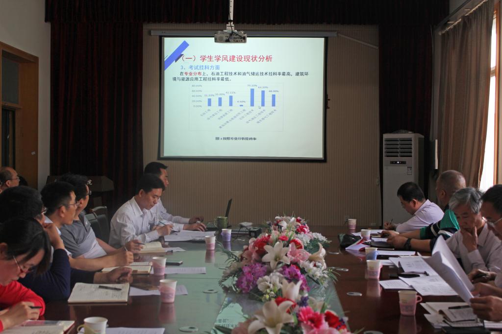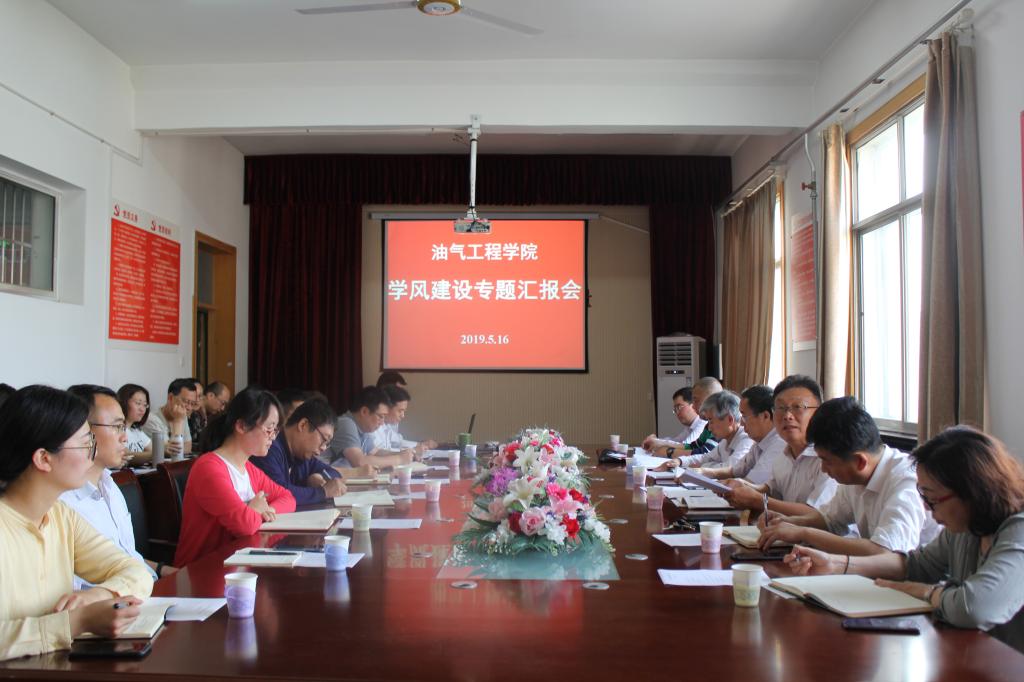 5月16日下午,油气工程学院召开学风建设专题汇报会。学校教学督导委员会主任马存栋,副主任周西臣、王全友、王卫军带领学风建设专项督导组全体成员听取了汇报。高等教育与研究评价中心主任李军、副主任巴永青,油气工程学院执行院长梁敬升、党总支书记章志军、副院长代晓东及教师代表、辅导员参加了会议。