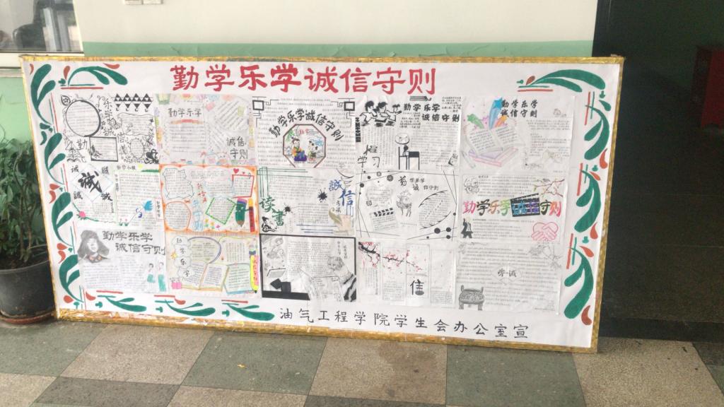 为使同学们形成良好的学习氛围,养成良好的勤学乐学学习习惯、诚信守则学习态度,5月20日下午四点,油气工程学院成功开展“勤学乐学,诚信守则”学风建设手抄报评比活动,辅导员老师王成担任本次评选活动的评委。本次活动面向我院2017、2018级全体同学。