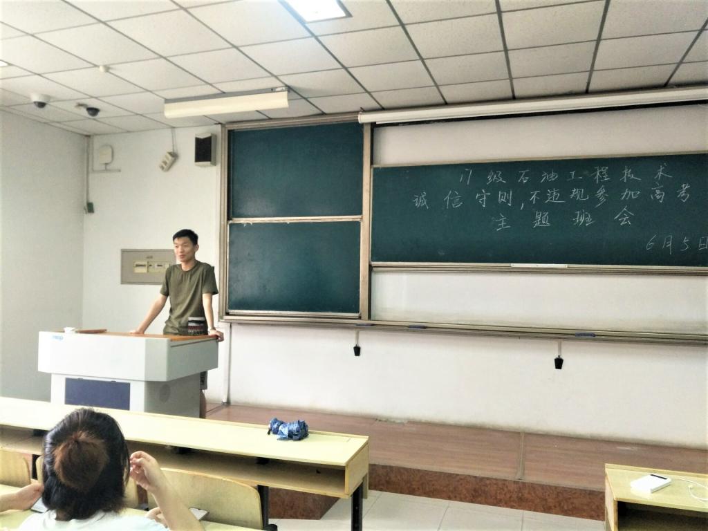 为了树立大学生诚信品质,营造优良学风考风,6月5日下午四点,油气工程学院2017级石油工程技术全体同学在第四教学楼105教室举行了题为“诚信守则,不违规参加高考”的主题班会。会议由17级石油工程技术班长莫军山主持。