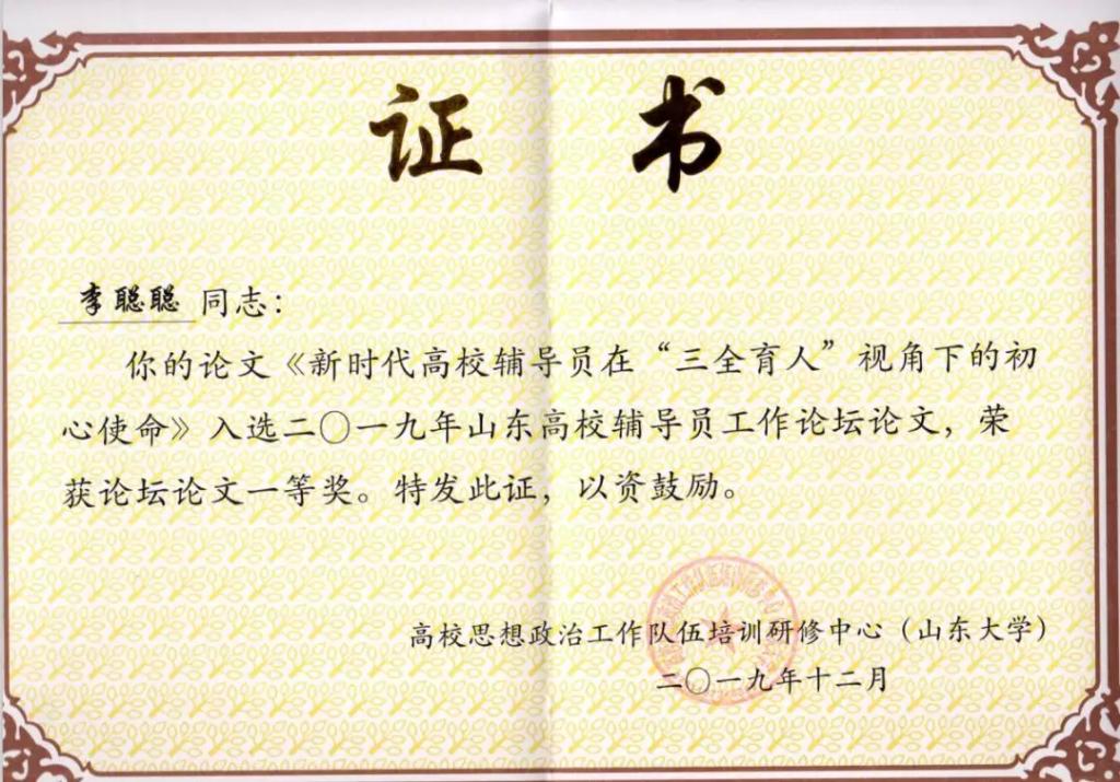 12月26日至27日,2019年山东高校辅导员工作论坛以“新时代高校辅导员的初心使命与责任担当”为主题在山东大学举办,我院辅导员李聪聪的论文《新时代高校辅导员在“三全育人”视角下的初心使命》荣获一等奖,并作为获奖代表进行了发言。