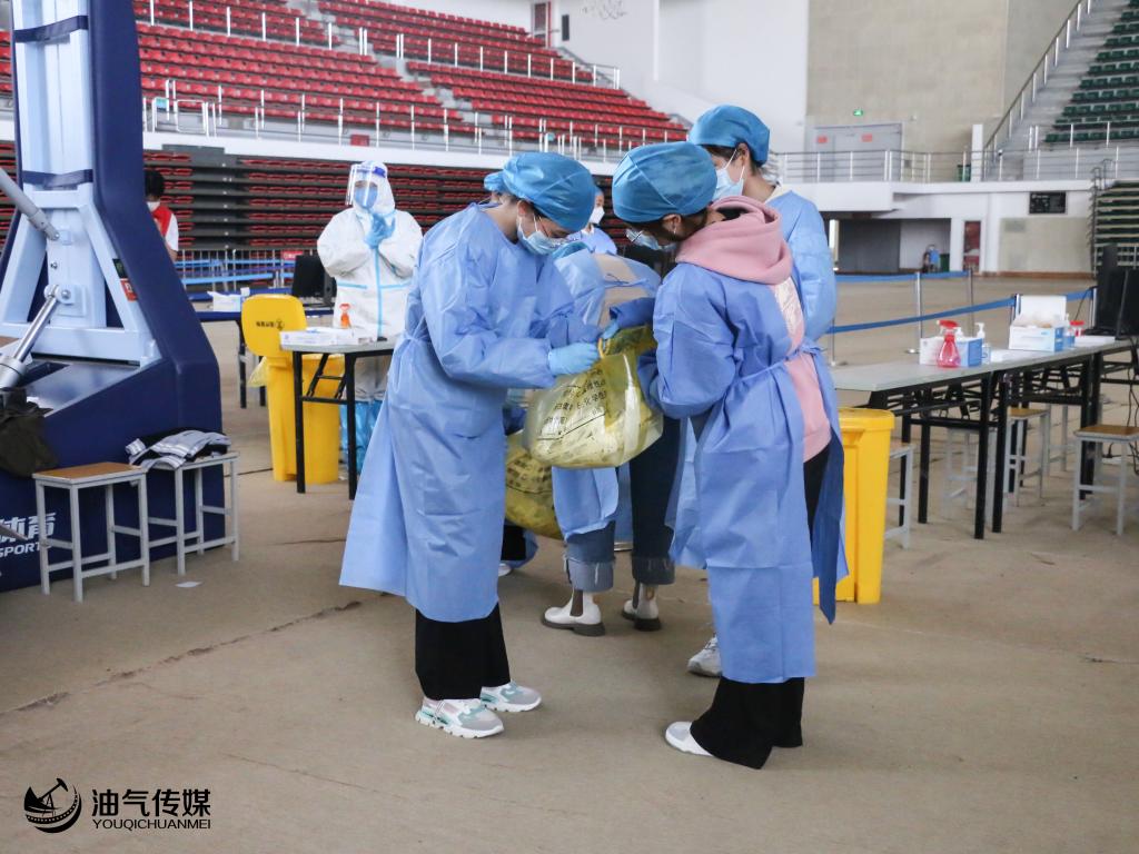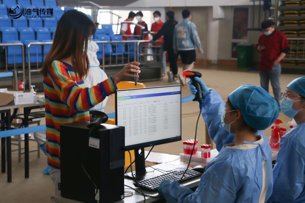 蓝色的防护服、手套和帽子需要在检测之前就穿戴完毕,除此之外,志愿者还需检查电脑设施是否可以正常运行,并登录账号。在开始检测时,录入人员的健康码信息,处理一些常见的问题,人员组成一份后,核对管码二维码,并把新的采样管递给医护人员,方便医护人员进行样本收录,做到了细心、严谨,与医护人员密切配合。穿队服的志愿者在大门观察队伍,控制队伍长短,及时放行,在检测管道的志愿者则提醒人们,保持一米以上的距离,将人员引入相应的检测通道。