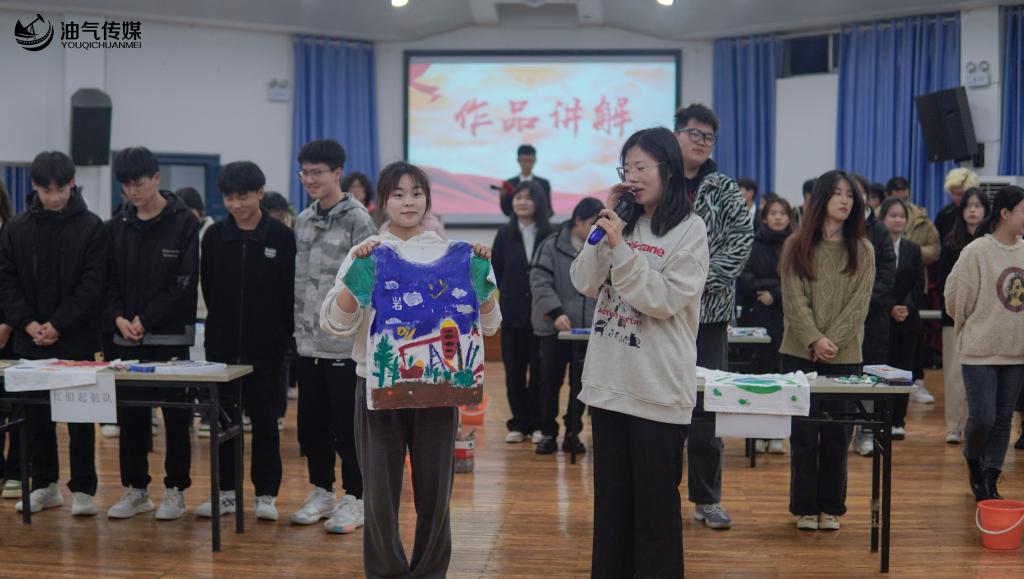 第二环节为“作品讲解”环节。绘画结束后,各参赛队伍依次上前讲解自己的白T恤创作理念,向评委及观众们展示了自己眼中对祖国十年来强盛发展的描绘,更表达了对美好未来的向往,同时也展示了同学们眼中山石独特的美丽风景。