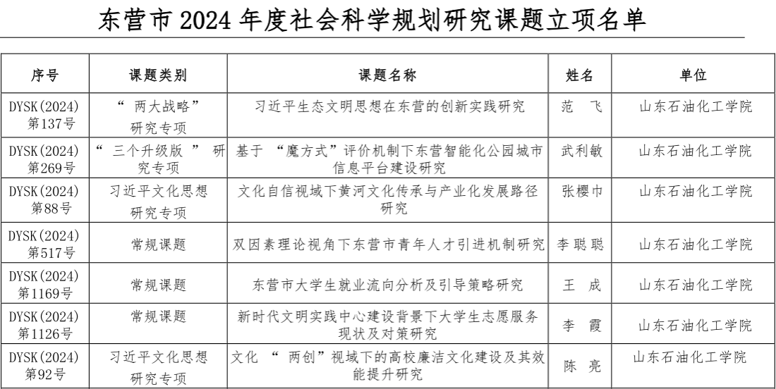 近日,东营市2024年度社会科学规划研究课题立项名单公布,我校“校企协同 就业育人”辅导员工作室共有7项社会科学规划研究课题和1项自然发展基金获批,为工作室的建设发展奠定了坚实基础。